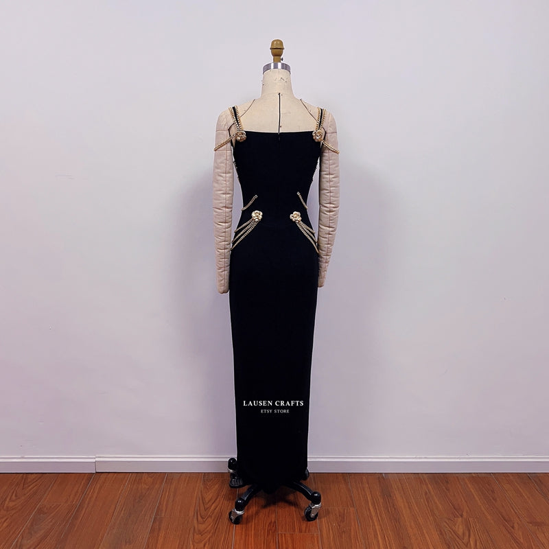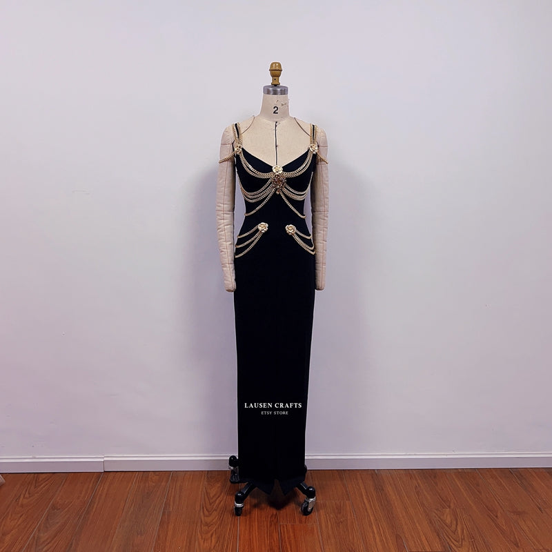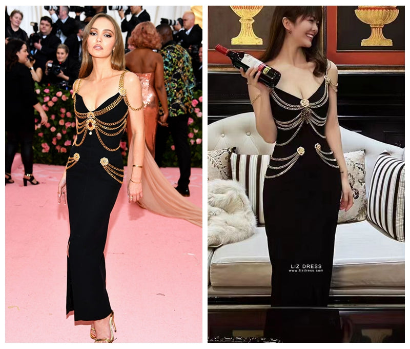 Lily-Rose Depp Inspired Black Dress with Gold Chains Met Gala 2019