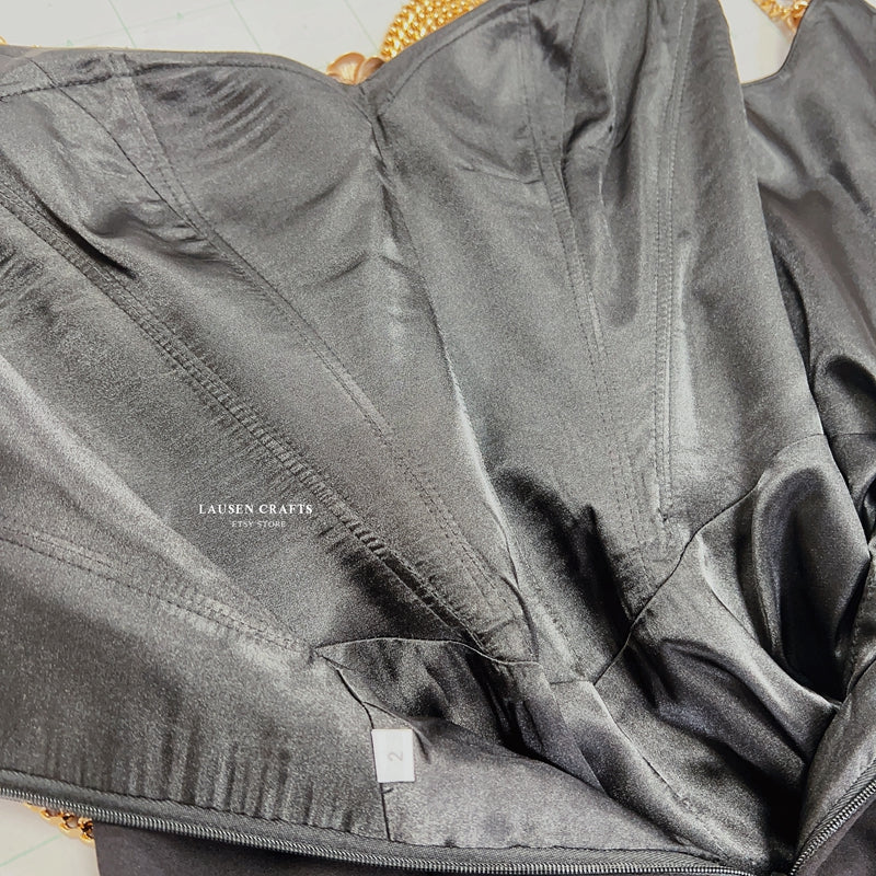 This is a recreation we made of Lily-Rose Depp Met Gala 2019 dress. Lily Rose Depp Met Gala dress is an ankle length formal dress, featured column sheath silhouettes, decorated with gold chains and brooches, the dress also has a centre slit at the front of skirt. The fabric and materials we use are not cheap, the bodice structured with built-in cups and bones, similar as corset bodice.